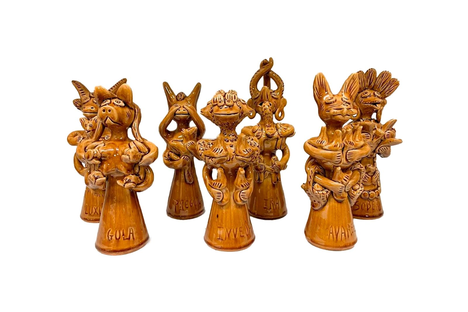 Este conjunto de esculturas em cerâmica esmaltada é uma obra singular que traduz, em formas lúdicas e expressivas, a simbologia dos sete pecados capitais: Gula, Luxúria, Preguiça, Inveja, Ira, Avareza e Soberba.
