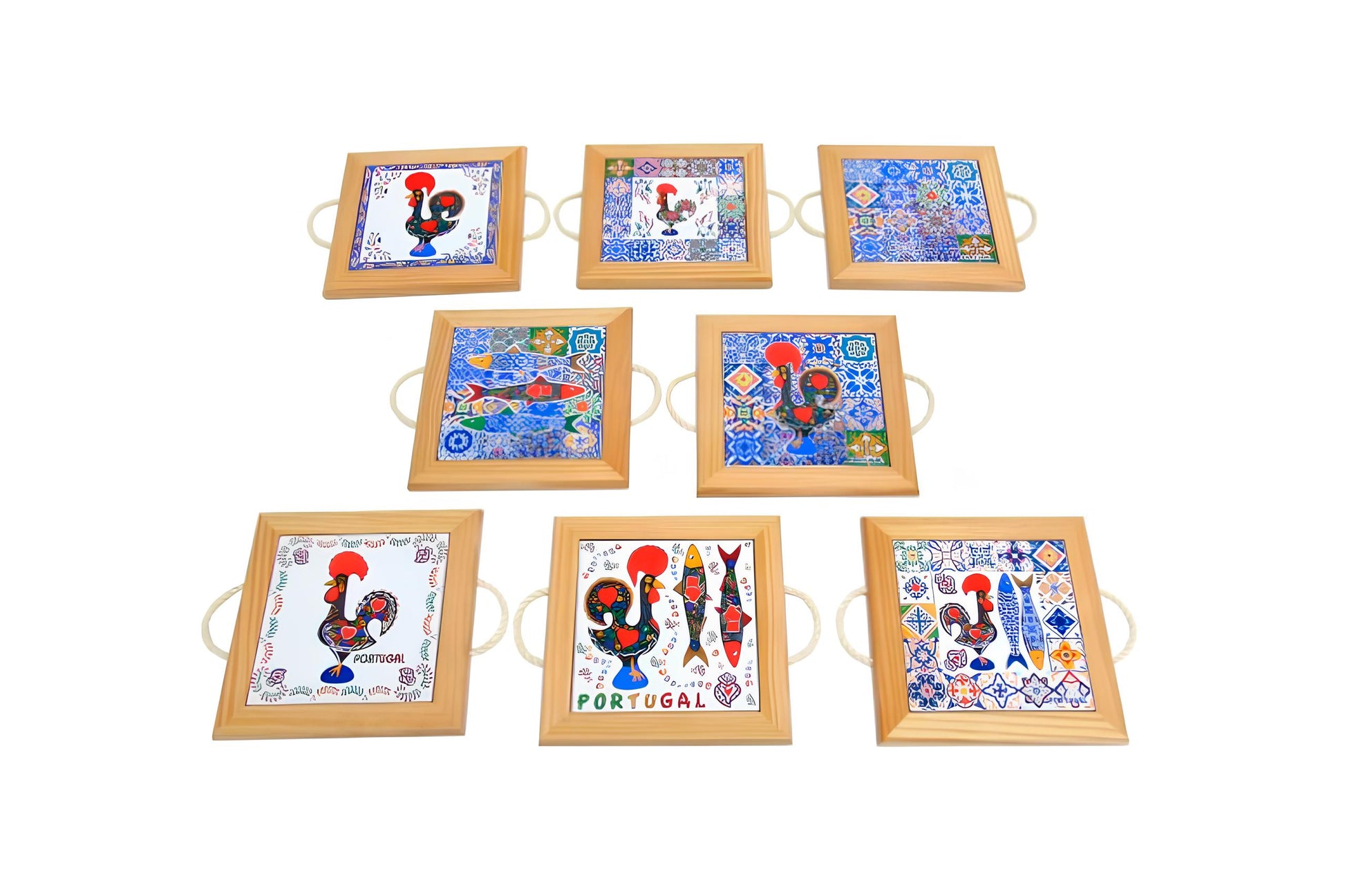 Mais do que um simples acessório de cozinha, estas bases unem tradição, cor e funcionalidade num só elemento. Cada peça apresenta um azulejo cerâmico com motivos emblemáticos portugueses – como o Galo de Barcelos e as típicas sardinhas – enquadrado numa moldura de madeira clara com pega em corda natural para fácil manuseio. Uma forma encantadora de proteger superfícies quentes e decorar com autenticidade.