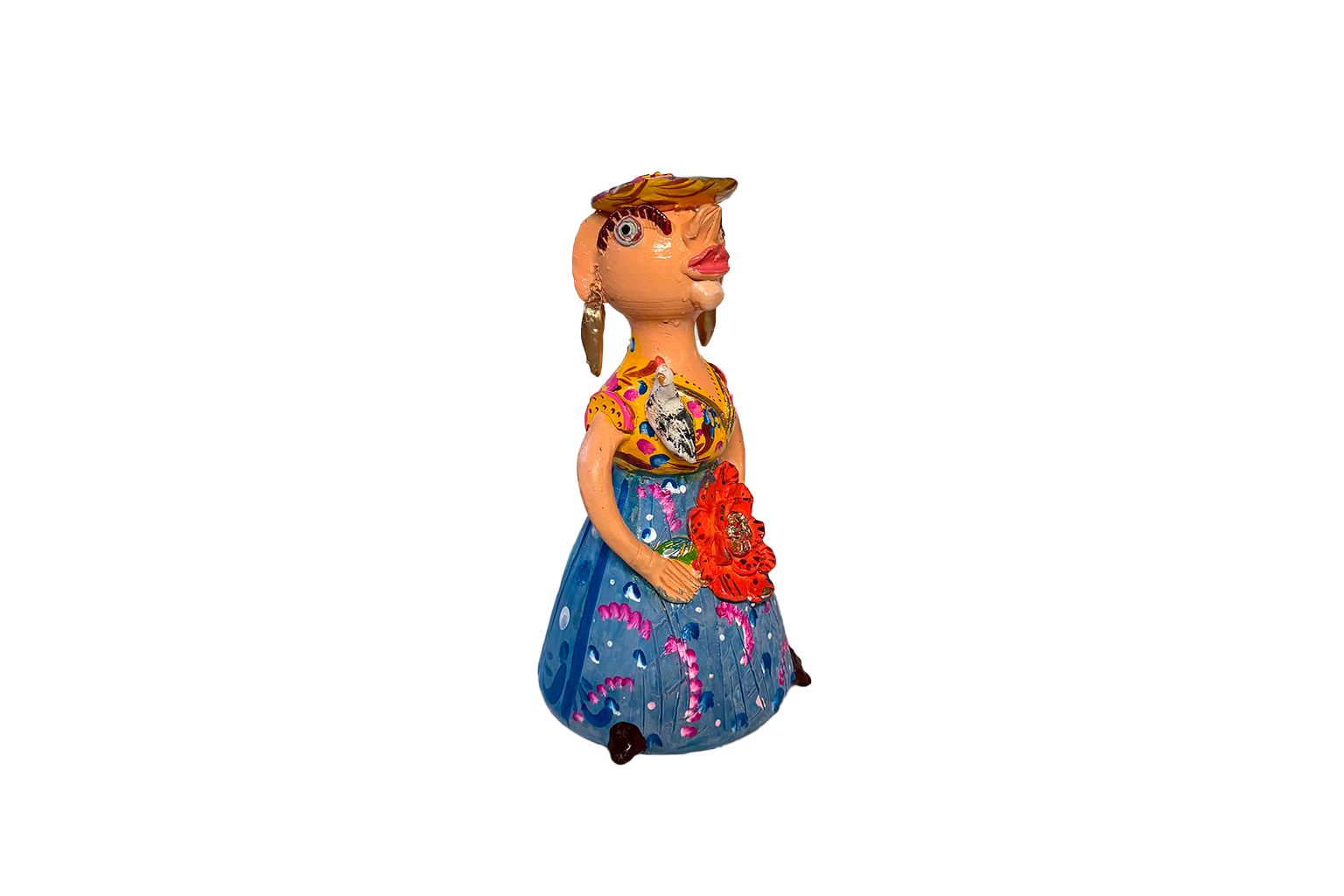 Esta charmosa figura feminina é uma criação única da renomada artesã mineira Júlia Côta, ícone da arte popular brasileira. Com aproximadamente 25 cm de altura, feita em cerâmica, a peça retrata uma mulher com vestido colorido, florido e detalhes pintados à mão, segurando um buquê vibrante. Com expressão marcante e adornos típicos, a escultura carrega a essência da cultura do Vale do Jequitinhonha. Ideal para colecionadores, amantes da arte popular ou para dar um toque autêntico e cheio de identidade ao seu espaço.