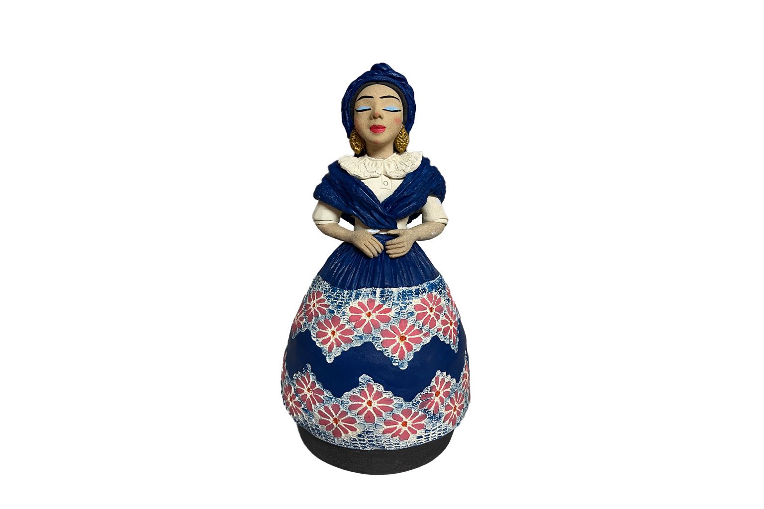 Beleza e tradição que se unem nesta escultura artesanal em cerâmica, com aproximadamente 40 cm de altura, que retrata uma mulher vestida com traje típico minhoto, em tons de azul e rosa. Os detalhes do vestido, com padronagem floral e geométrica, revelam o cuidado e o talento do artesão.