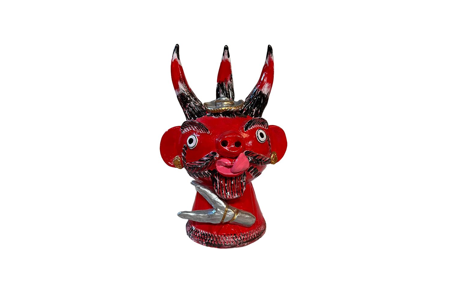 Peça de cerâmica artesanal criada por Prazeres Côta, um dos nomes mais emblemáticos da arte popular portuguesa. Esta escultura representa o Diabo, figura recorrente no imaginário popular minhoto, com expressividade exagerada, cor intensa e detalhes simbólicos, como os chifres e o peixe na boca. Com cerca de 30 cm de altura, modelada e pintada à mão, esta peça exibe o estilo único da artista: uma fusão de tradição, crítica social e teatralidade, com um toque de humor e irreverência característicos da cerâmica de Barcelos.