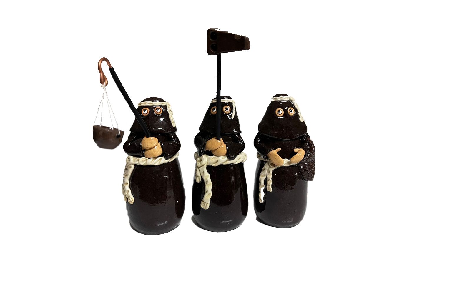 Conjunto em cerâmica artesanal que representa os Farricocos de Braga, figuras simbólicas da Semana Santa, conhecidas pelas suas vestes escuras e gesto penitencial.