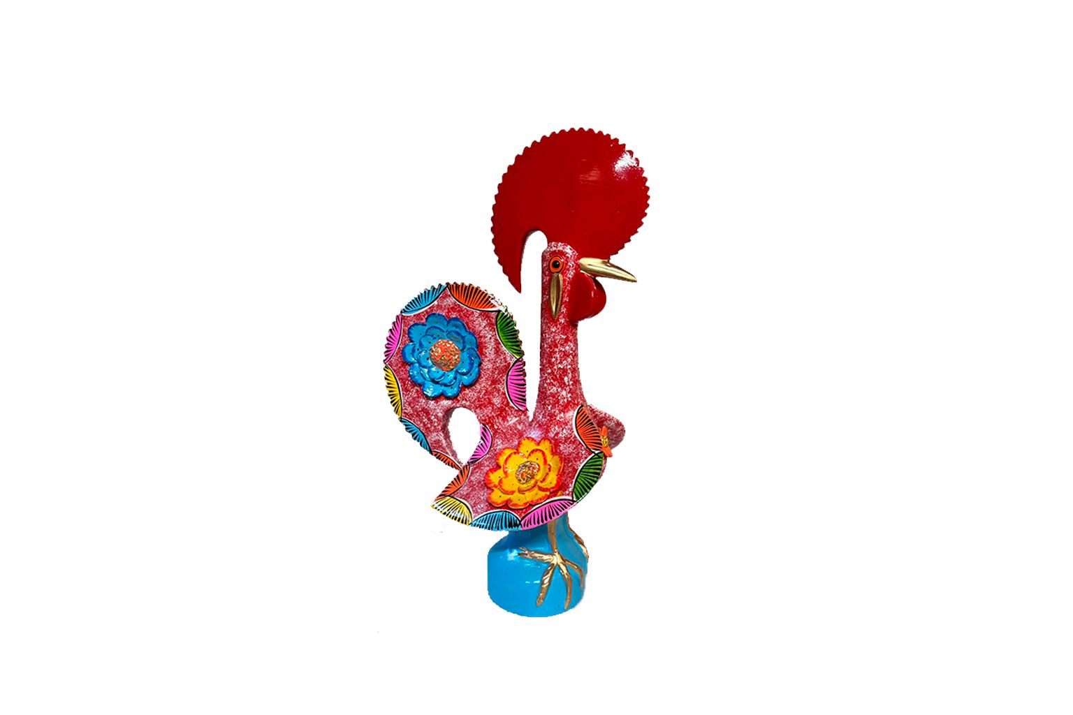 Peça artesanal única feita por Prazeres Côta, renomada artesã portuguesa. Este belo Galo de Barcelos, com 55 cm de altura, símbolo tradicional de Portugal, é cuidadosamente pintado à mão com cores vibrantes e padrões florais típicos, destacando-se pela sua riqueza cultural e artística.