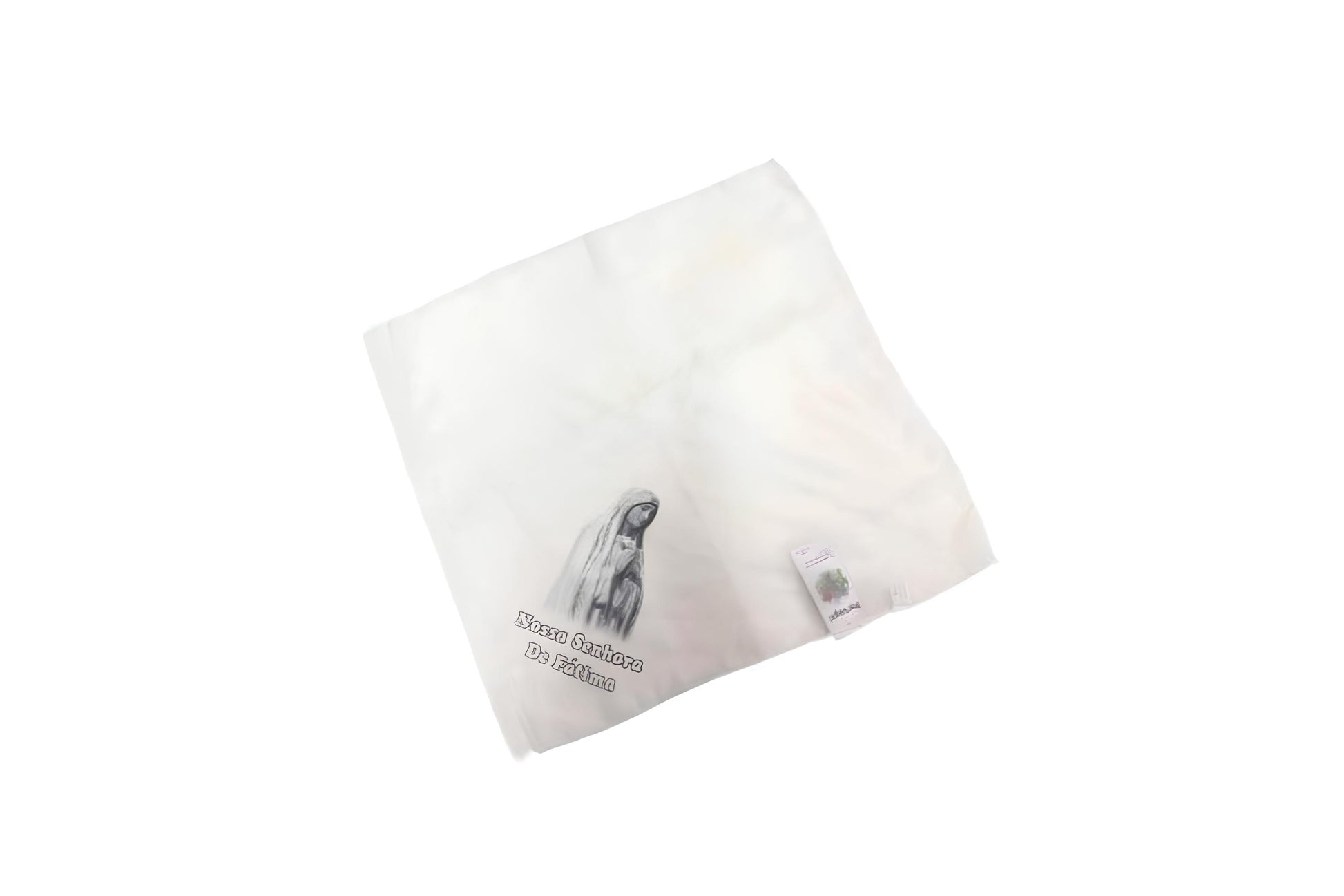 Lenço branco suave com imagem discreta e elegante de Nossa Senhora de Fátima, acompanhado da inscrição “Nossa Senhora de Fátima”. Ideal como lembrança devocional, acessório para momentos de oração ou para usar em celebrações religiosas. Leve, simbólico e fácil de transportar, é uma forma delicada de expressar fé e devoção.