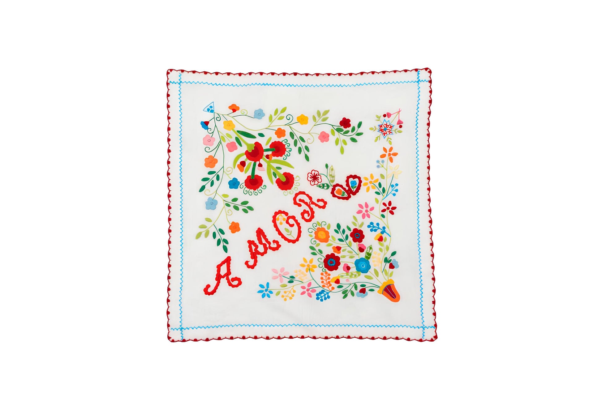 Este lenço é uma celebração vibrante do sentimento mais universal de todos: o amor. Bordado com um conjunto riquíssimo de flores, corações e borboletas, e com a palavra "Amor" destacada em letras grandes e encarnadas, esta peça representa a tradição minhota no seu expoente máximo.