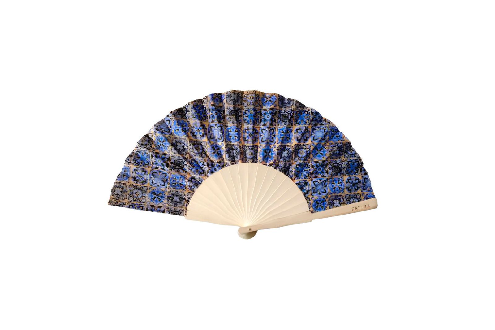 Leque tradicional com padrão de azulejos portugueses em tons de azul, inspirado na cultura e artesanato de Portugal. Fabricado com estrutura leve e resistente, é ideal para usar em dias quentes, combinando funcionalidade com um toque de elegância. Apresenta a inscrição "Fátima" na base, tornando-o uma excelente recordação de visita à cidade santuário ou um presente simbólico com valor cultural e religioso.