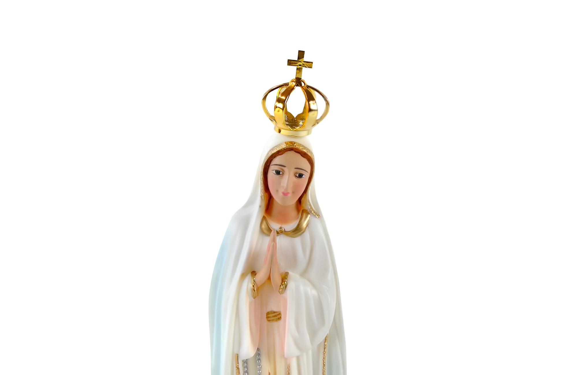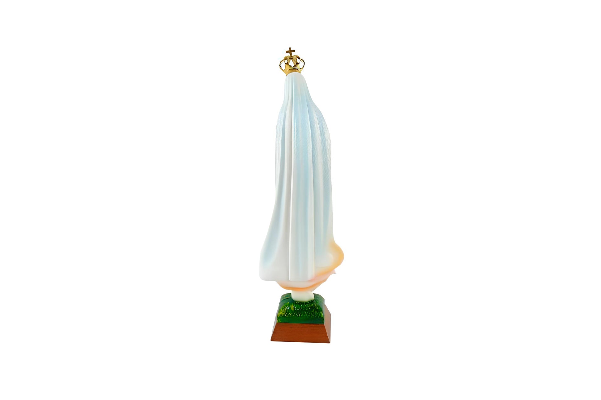 Símbolo de fé e devoção, esta imagem de Nossa Senhora de Fátima é uma homenagem delicada à tradição espiritual portuguesa. Cuidadosamente pintada com detalhes suaves e cores harmoniosas, representa a Virgem Maria com manto branco, coroa dourada e expressão serena, pousada sobre uma nuvem com pombas, remetendo à aparição de 1917 em Fátima.