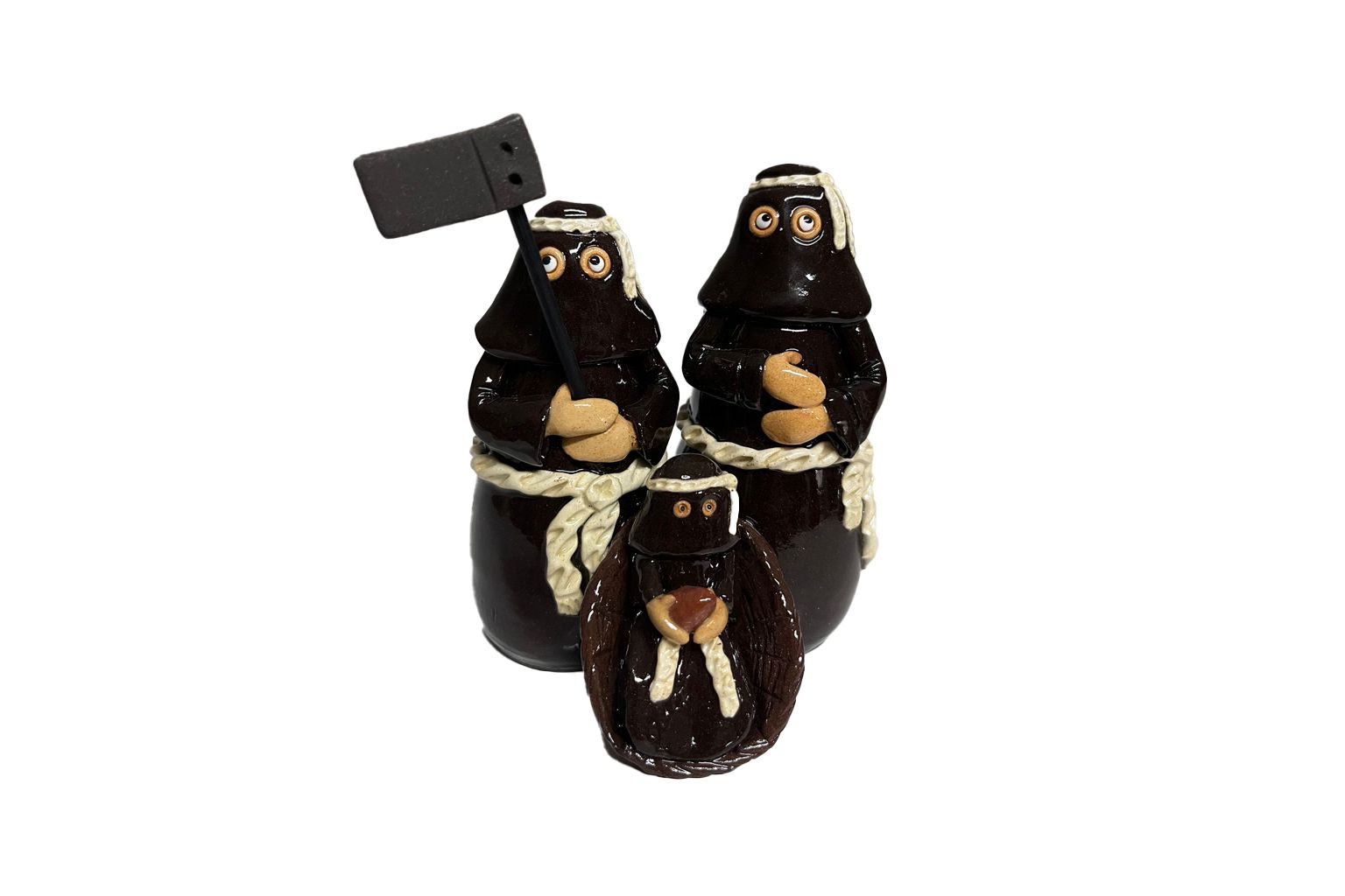Presépio artesanal em cerâmica representando os Farricocos de Braga, numa interpretação única da tradicional cena do nascimento de Jesus. As figuras, vestidas com as típicas túnicas escuras e cordões à cintura, evocam o espírito penitencial e a forte ligação da cidade de Braga à fé e à Semana Santa.