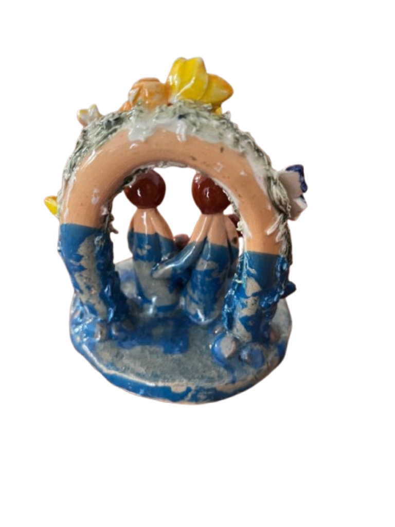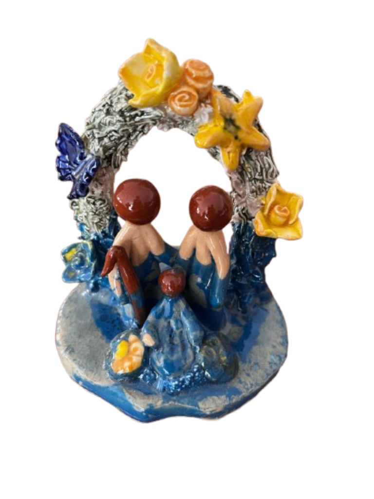 amor e proteção, representando São José, a Virgem Maria e o Menino Jesus em uma composição serena e profundamente espiritual. Este presépio, criado pelo artesão Joaquim Messias, é uma obra em cerâmica artesanal que combina tradição e sensibilidade artística.