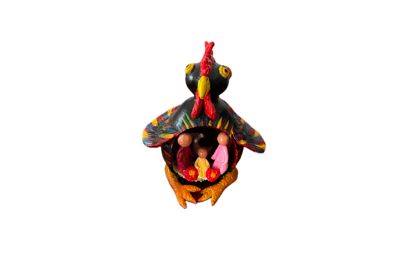 No interior do galo, encontra-se um delicado presépio em miniatura, moldado e pintado à mão com todo o rigor e dedicação que distinguem o trabalho do artesão. Cada figura revela expressão e ternura, refletindo o cuidado e a mestria que tornam esta criação tão especial.