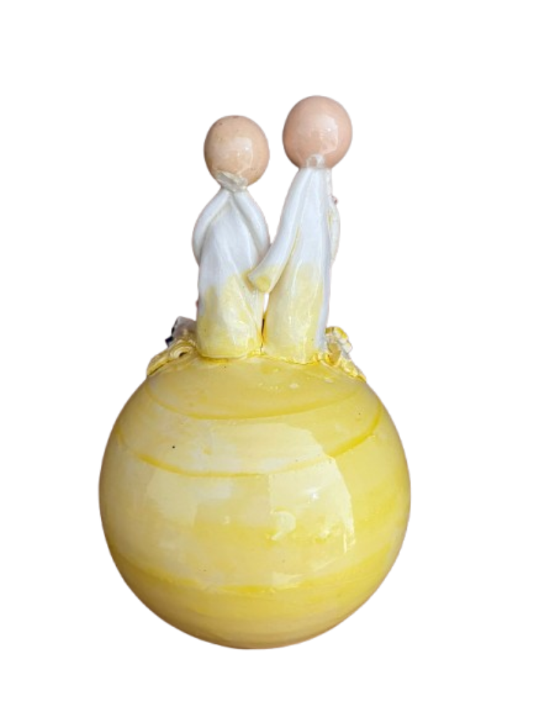Com acabamento meticuloso e pintura em tons suaves e terrosos, a peça reflete a ternura do momento do nascimento de Cristo, evocando paz, fé e devoção. As formas simplificadas e harmoniosas, características do estilo do artista, realçam a pureza da cena e o equilíbrio entre o humano e o divino.