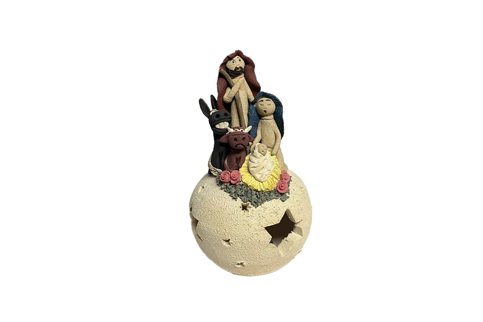 Com cerca de 20 cm de altura, a peça representa a Sagrada Família acompanhada pelo boi e pelo burro, sobre uma esfera decorada com recortes em forma de estrelas, que acrescentam leveza e simbolismo à composição. Os tons suaves e o acabamento texturizado realçam o caráter artesanal e a autenticidade de cada exemplar.
