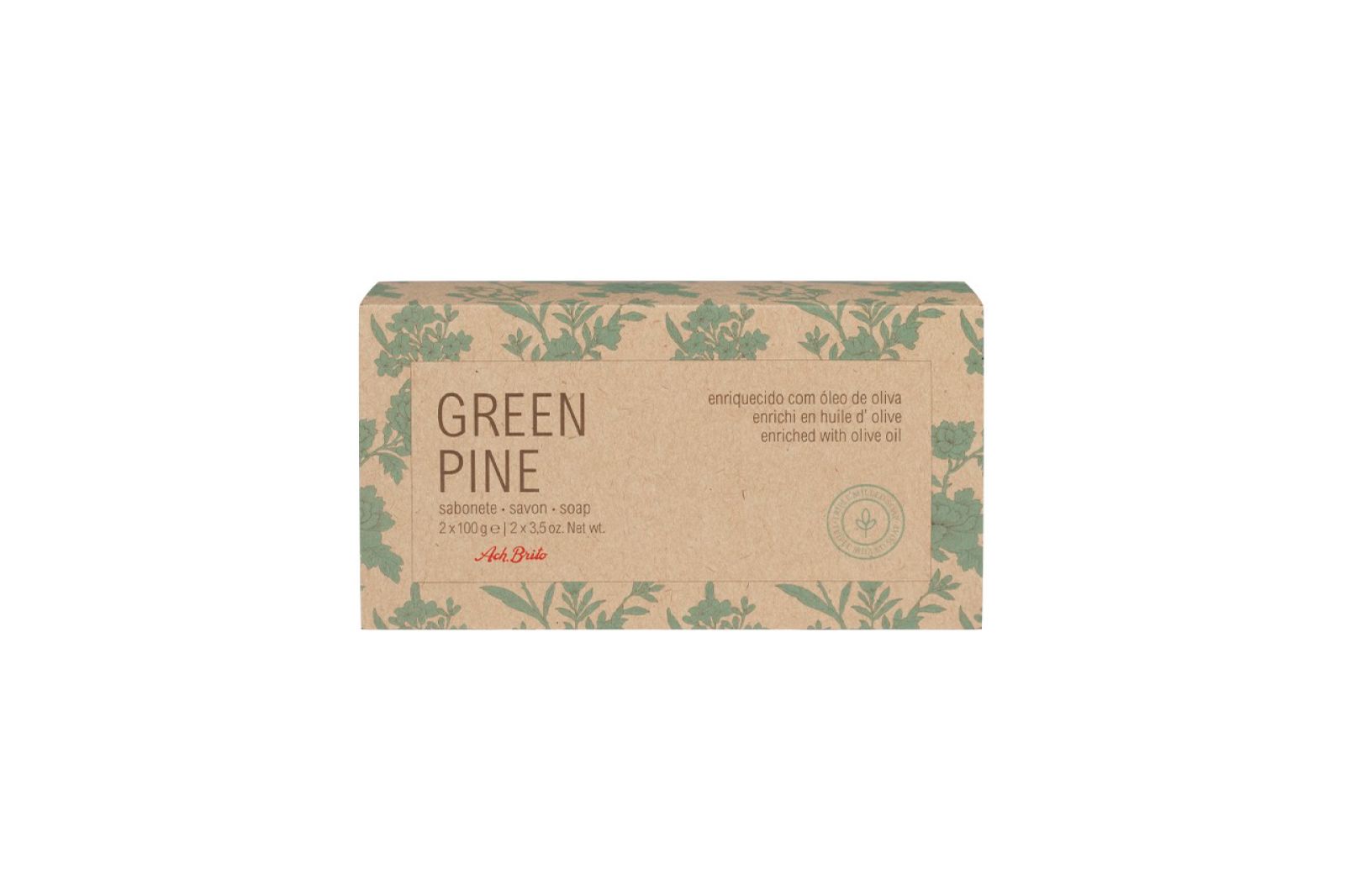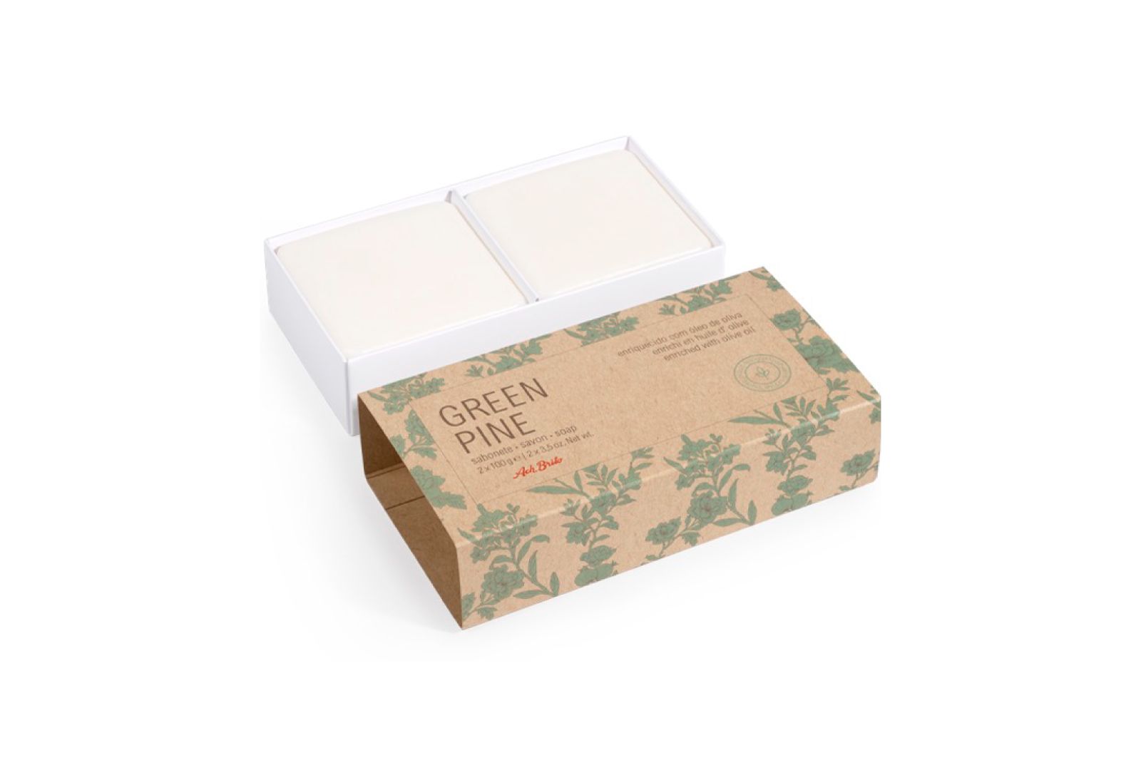 A caixa Green Pine da Ach. Brito é uma celebração dos aromas frescos da floresta. Com um design minimalista e sustentável em papel kraft, esta embalagem contém dois sabonetes de 100g com um perfume leve e revigorante de pinho verde.