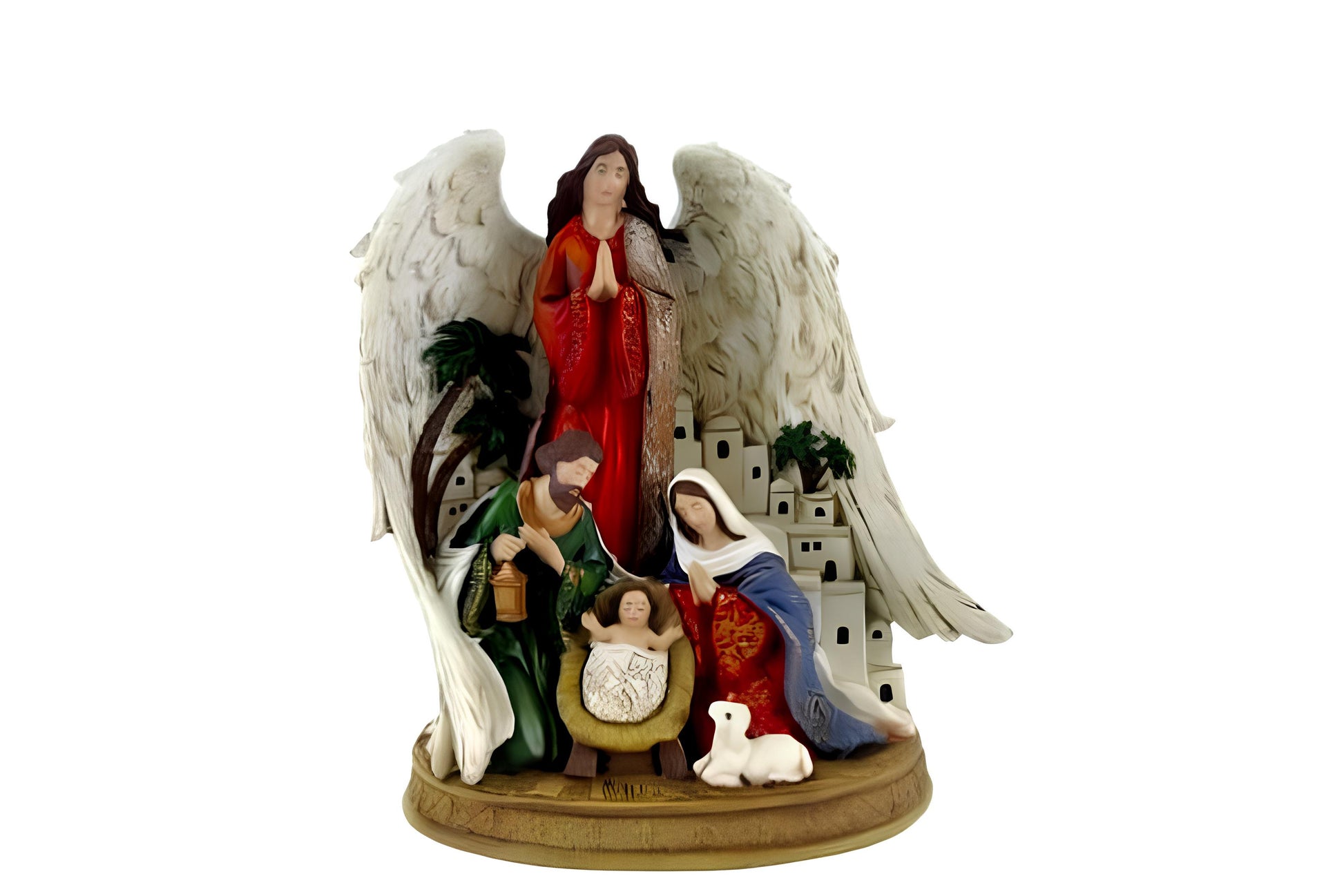 Peça religiosa em resina de alta qualidade, com 22 cm de altura, representando a cena do nascimento de Jesus com a presença de Maria, José, o Menino Jesus, um anjo protetor e outros elementos simbólicos. Os detalhes pintados à mão, as cores vivas e a riqueza de texturas tornam esta imagem uma peça especial para a decoração natalícia ou para um espaço de devoção.