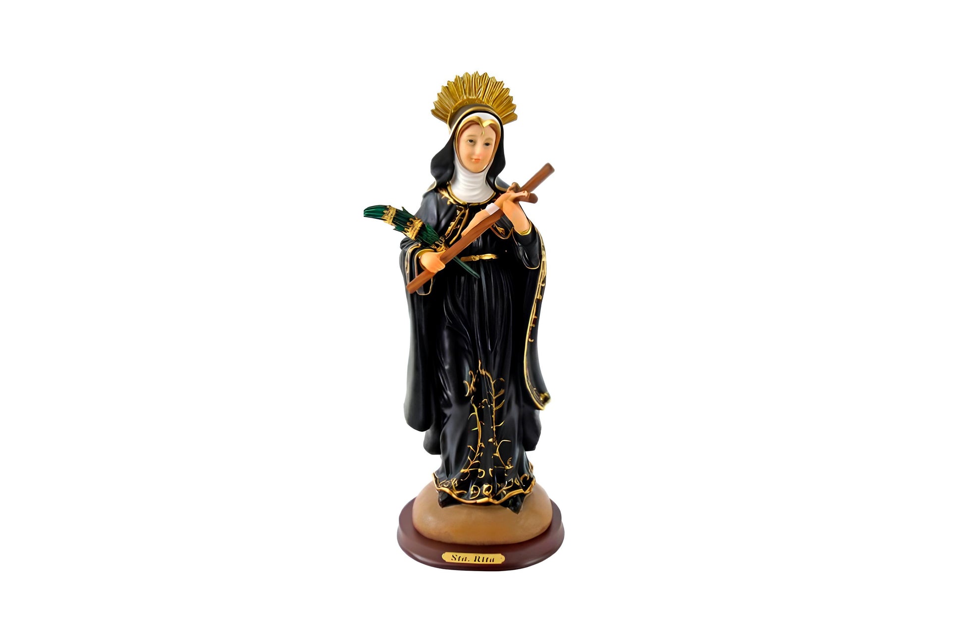 Esta imagem representa Santa Rita, padroeira das causas impossíveis, retratada com o seu hábito característico em tons escuros, adornado com detalhes dourados, segurando a cruz e uma palma — símbolos do seu martírio e santidade.