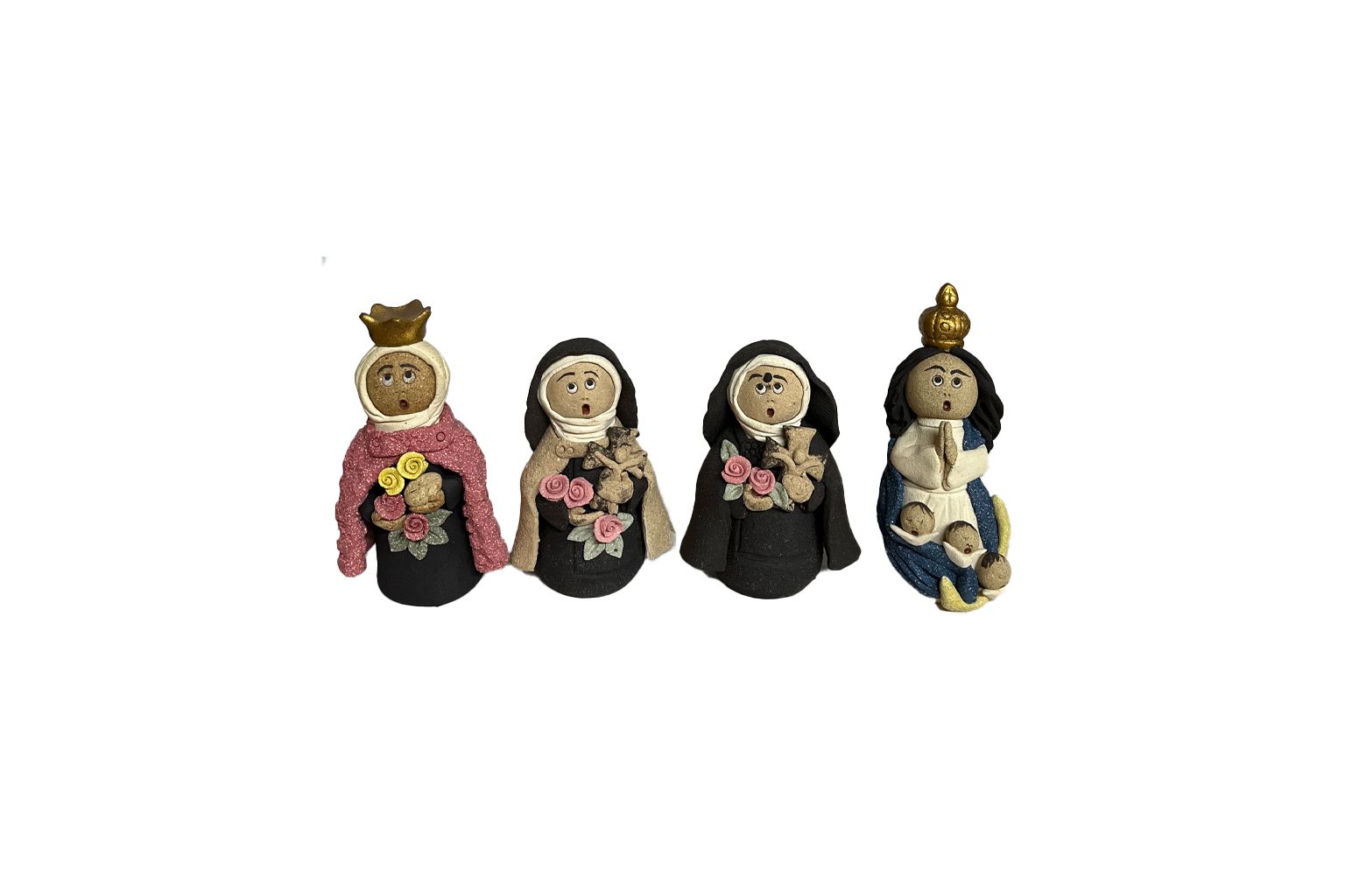 Estas delicadas peças de quatro figuras femininas de devoção católica em cerâmica artesanal, representadas com simplicidade e ternura no estilo da arte popular portuguesa. Com aproximadamente 12 cm de altura, cada santa é moldada e pintada à mão, com elementos simbólicos como flores, coroas e vestes tradicionais, refletindo fé, tradição e identidade cultural.