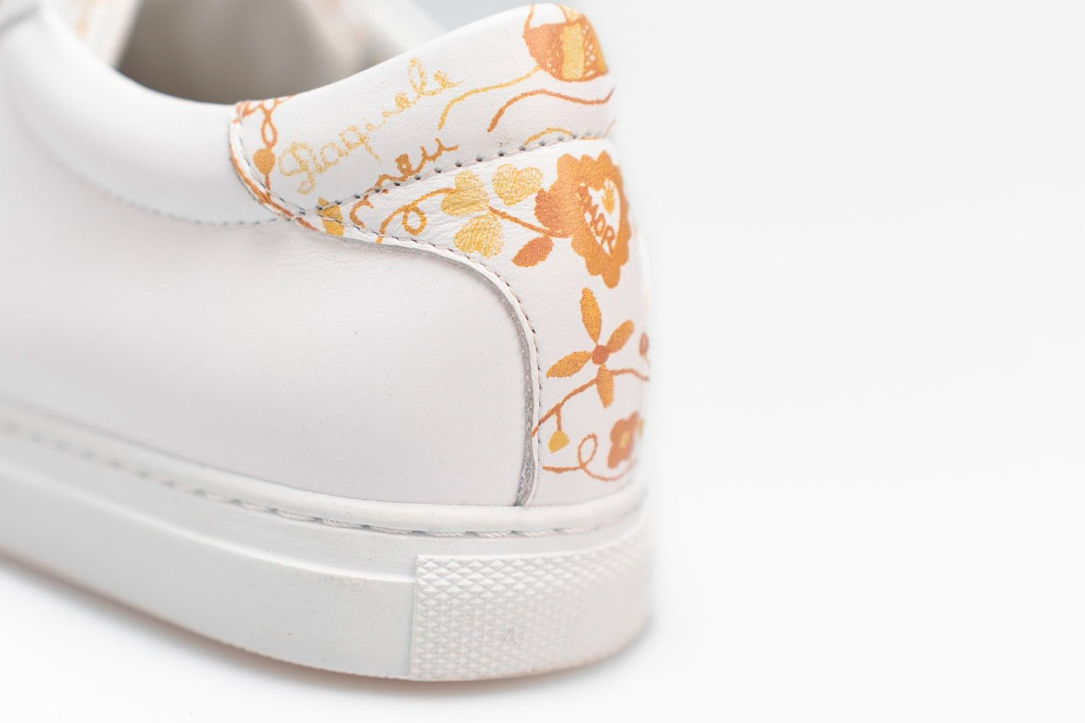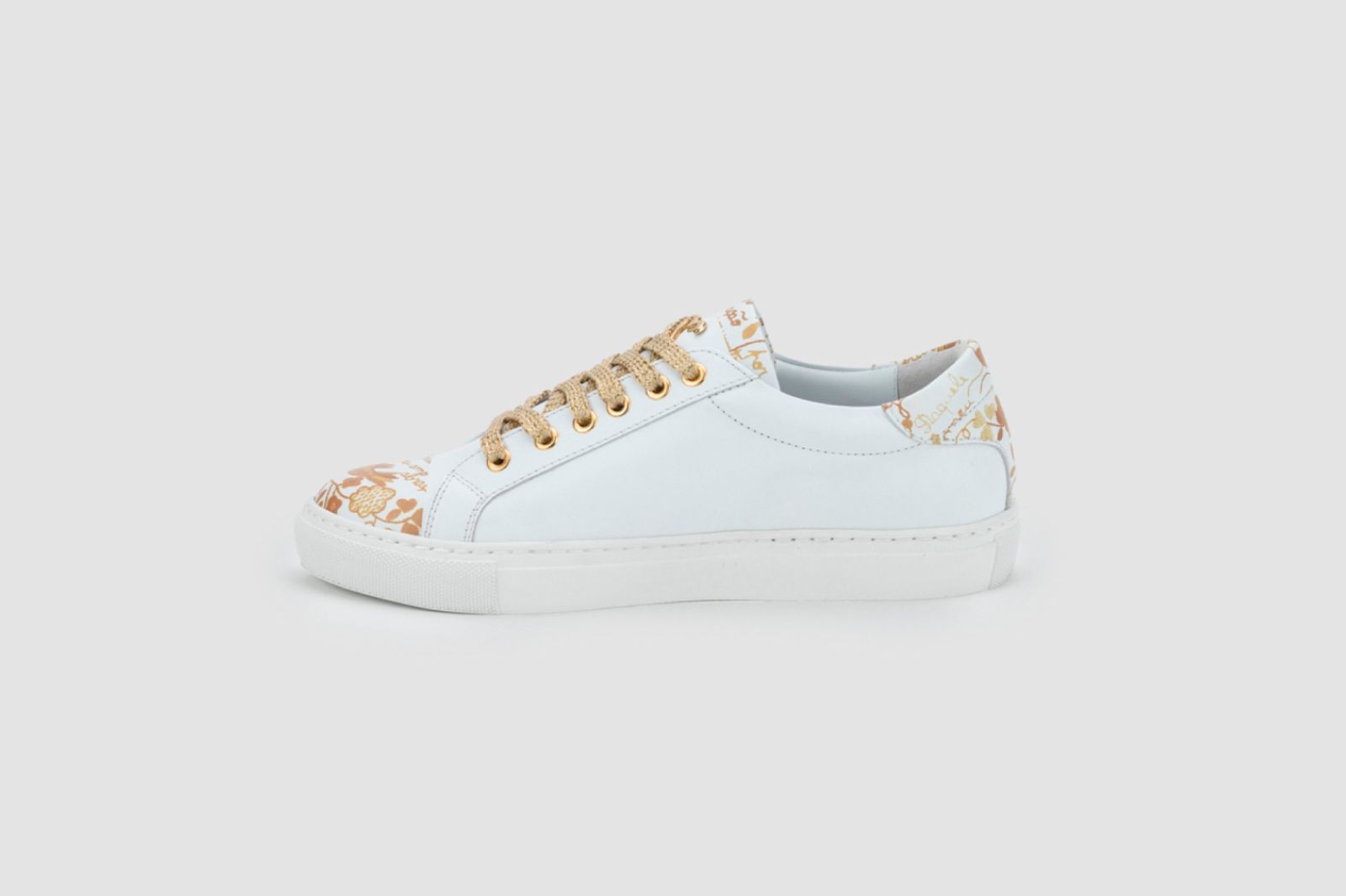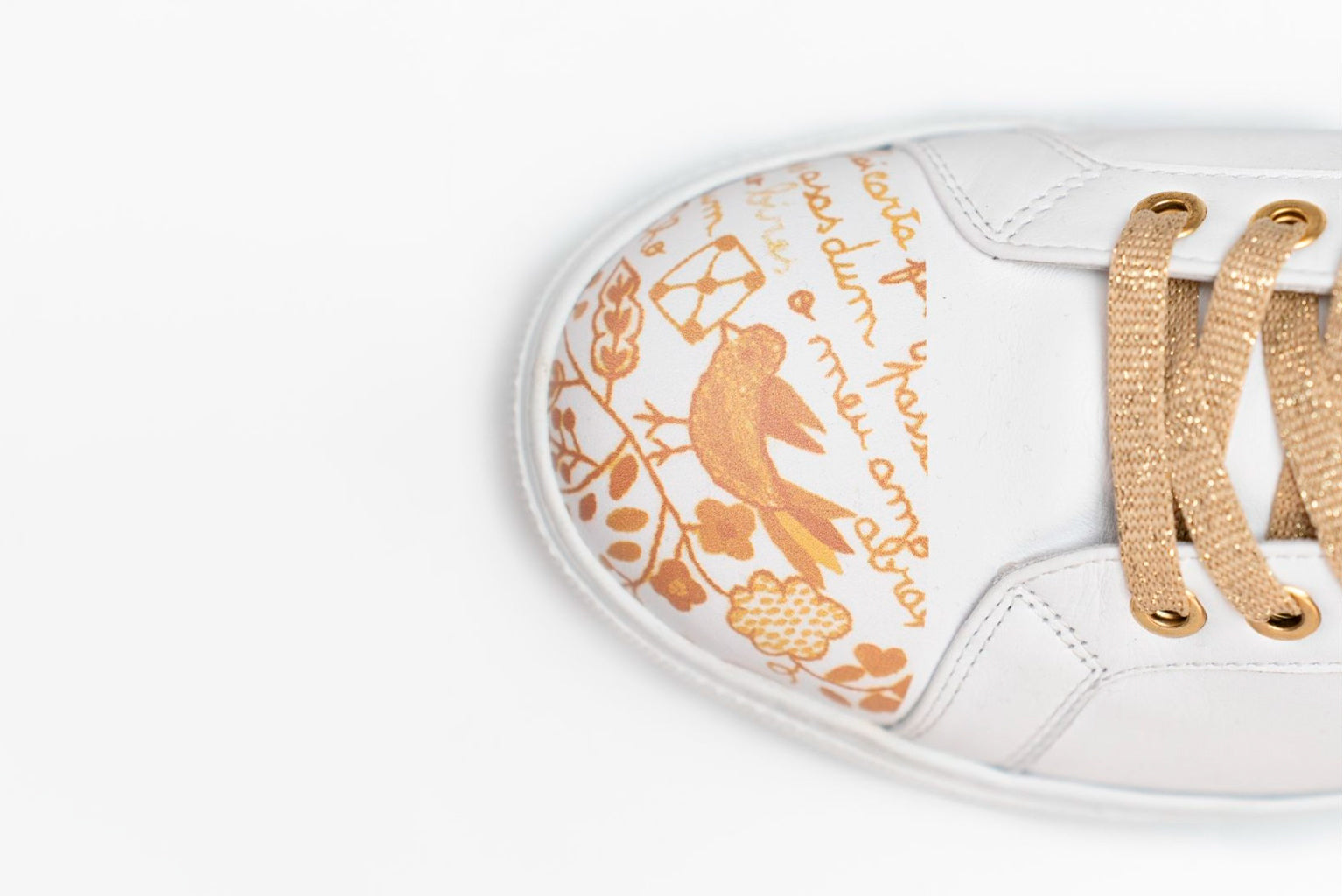 Um clássico reinventado com elegância e alma portuguesa. Estes ténis combinam a simplicidade do branco com detalhes em tons dourados inspirados nos tradicionais Lenços dos Namorados, criando um visual sofisticado e com identidade cultural.