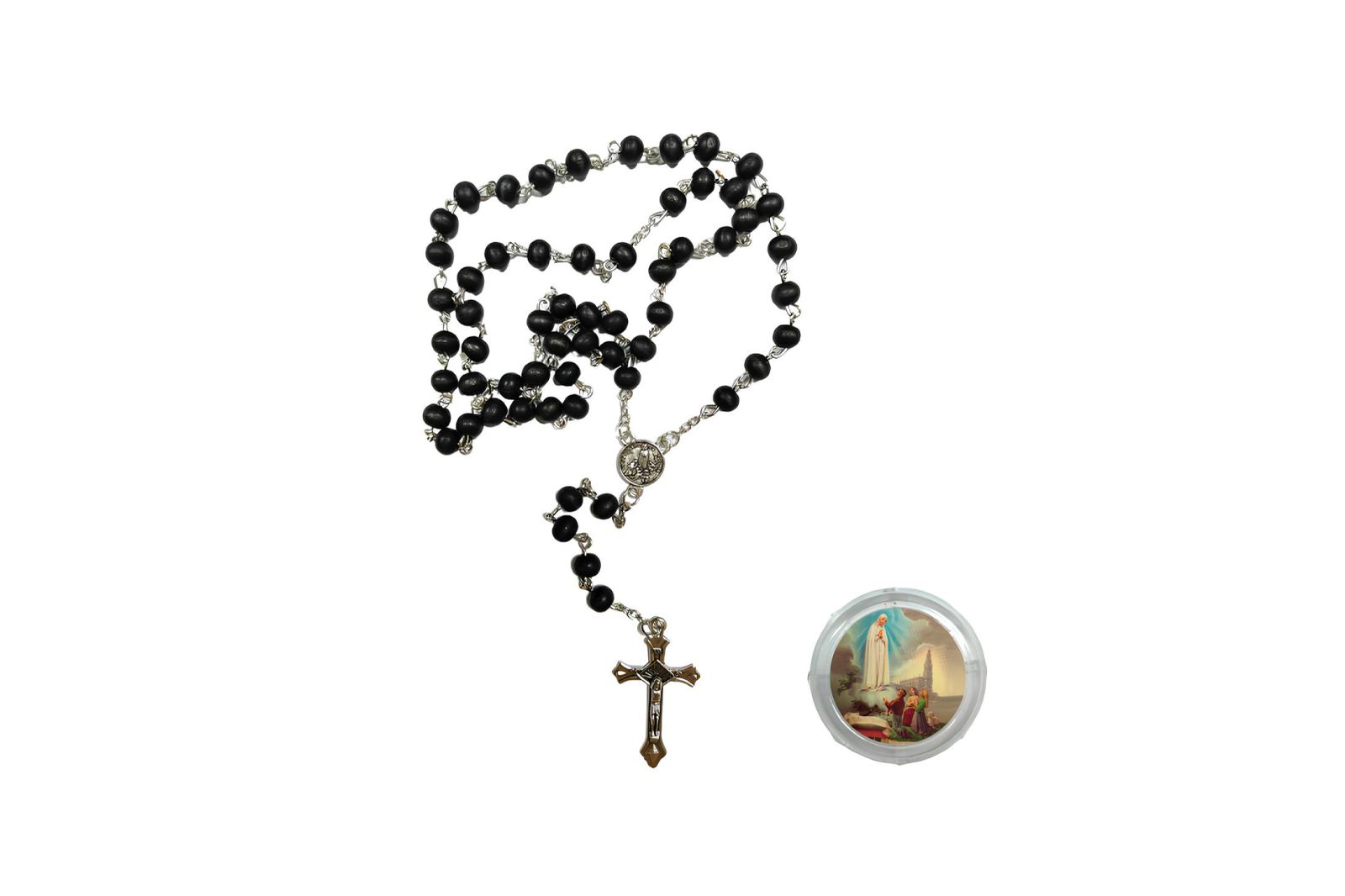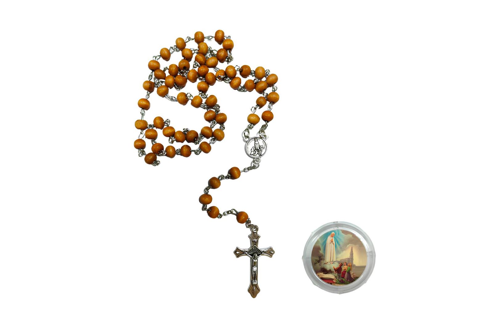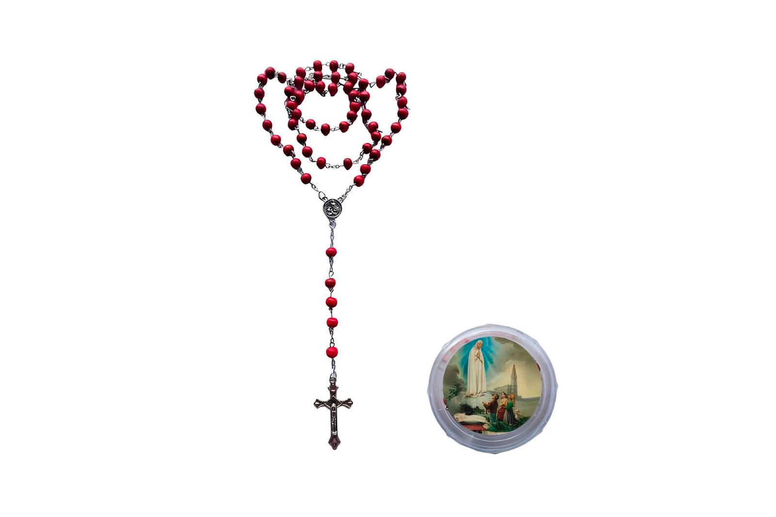 Acompanha uma prática caixa plástica redonda com tampa, decorada com imagem dos Pastorinhos e a aparição de Nossa Senhora, perfeita para guardar o terço com proteção e carinho.