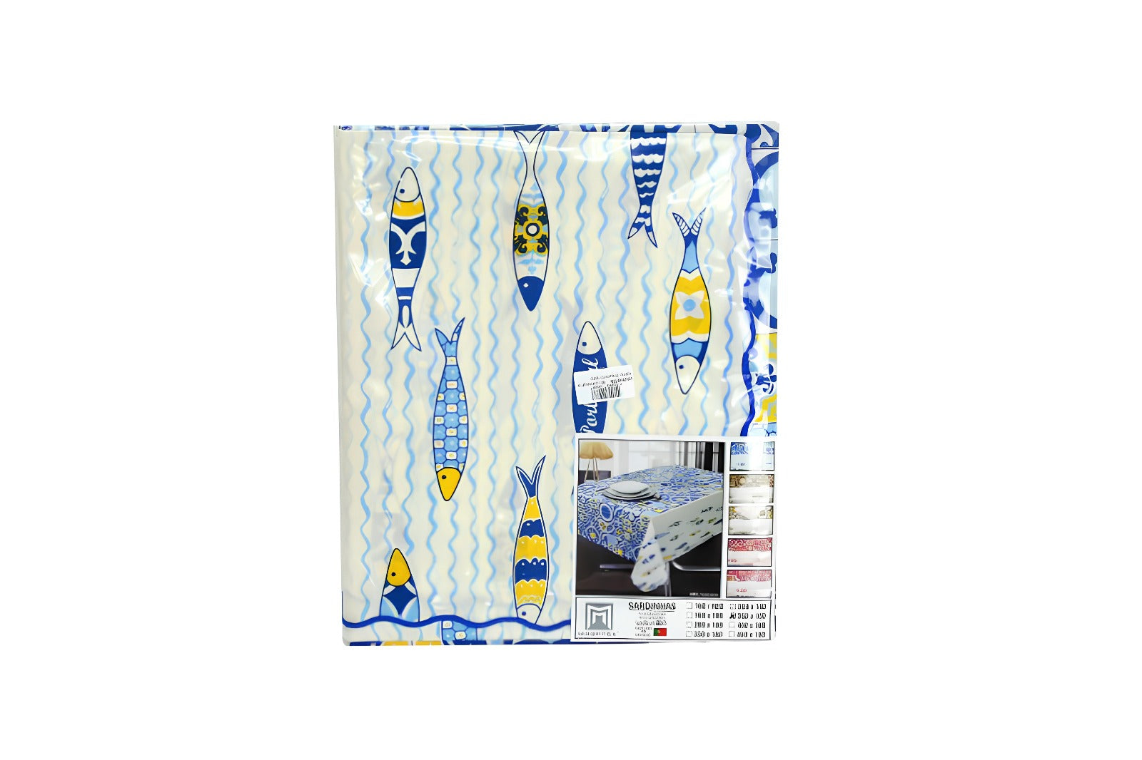 Inspirada nas festas populares e na tradição piscatória, esta toalha de mesa é um verdadeiro mergulho na alma lusa. Com sardinhas coloridas em tons de azul e amarelo sobre fundo claro com linhas onduladas, evoca o espírito alegre dos Santos Populares e do verão português.