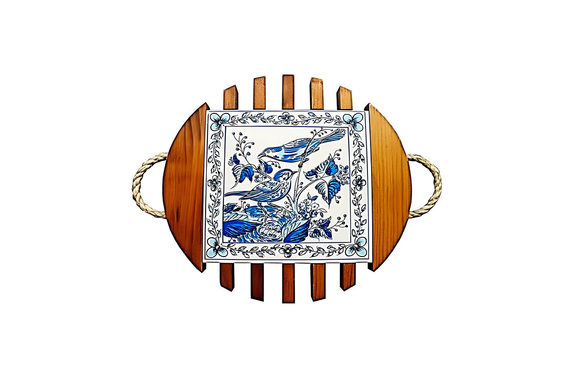 Mais do que uma simples base, esta peça combina funcionalidade com um toque rústico e elegante da tradição portuguesa. Com um conjunto de quatro azulejos decorados com delicadas ilustrações de pássaros em tons de azul e branco, moldura em madeira e cordas laterais para fácil transporte, é perfeita para servir com charme ou decorar com autenticidade.